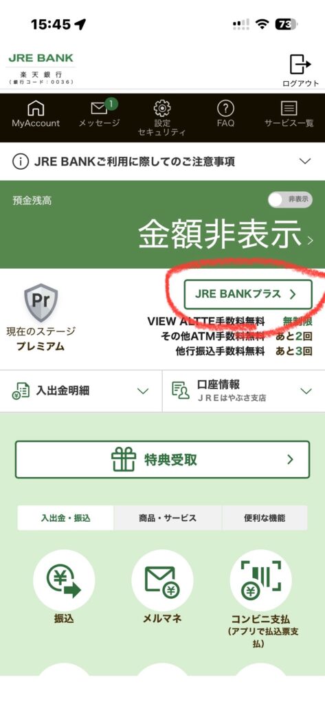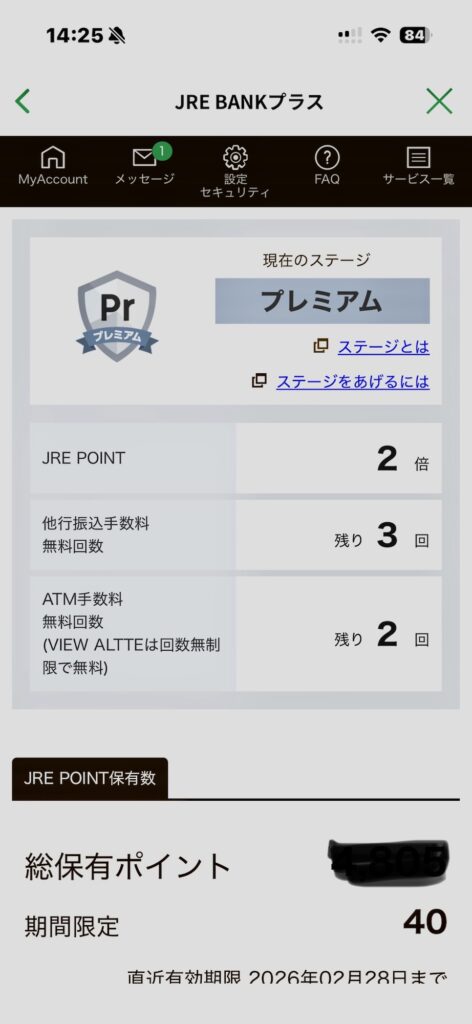 預金残高の下にあるJRE BANK プラスをクリックしたらステージと総保有ポイント確認できます