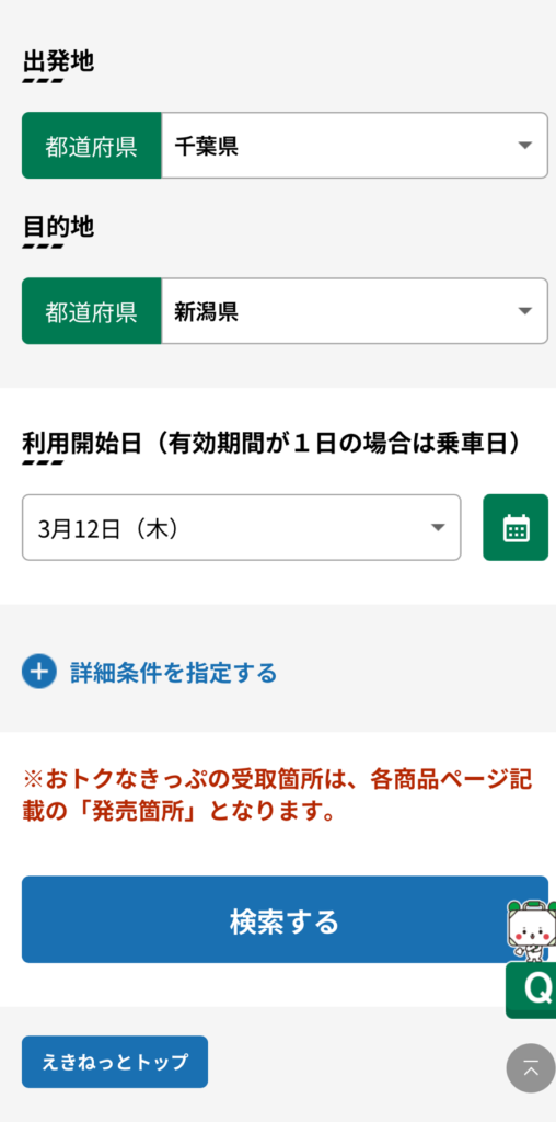 ③ おトクなきっぷの申込 出発地・目的地を選択