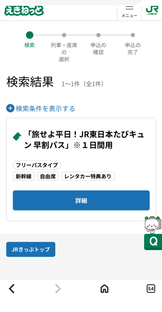 検索結果 「旅せよ平日!JR東日本たびキュン早割パス」1日間用 詳細を押します(日帰りの場合)
