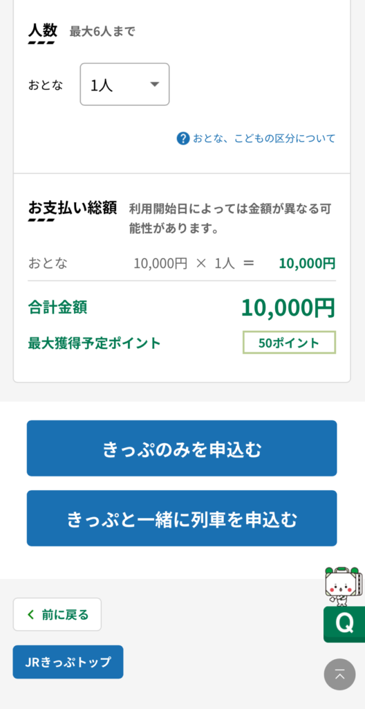 注意事項を確認し きっぷを購入 人数は 最大6人まで 選択できます。もちろん一人なので1人